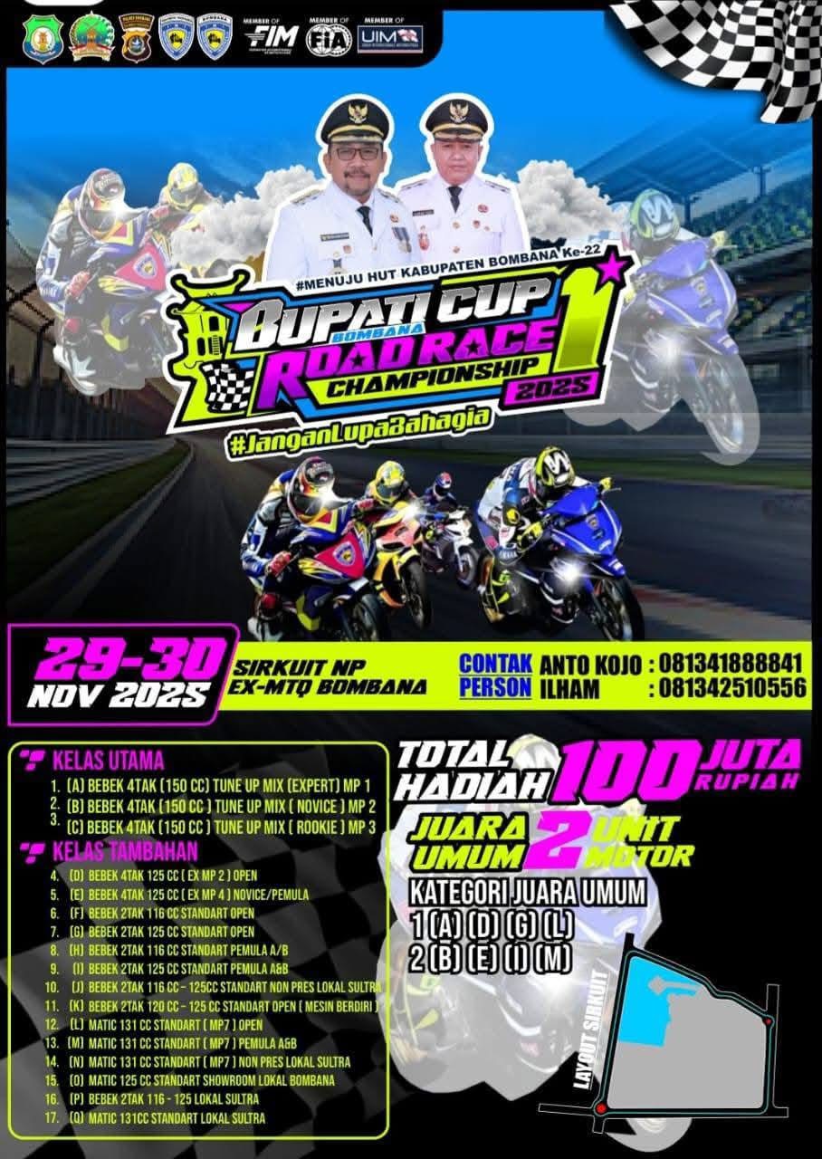 Bombana,A-1.Info / – Semarak peringatan Hari Ulang Tahun (HUT) Kabupaten Bombana ke-22 dipastikan semakin meriah dengan digelarnya ajang balap bergengsi Road Race Championship 2025 Bupati Cup I. Kompetisi ini akan berlangsung pada 29 hingga 30 November 2025 di Sirkuit Non Permanen (NP) Ex-MTQ Bombana, dan menjadi magnet baru bagi para pecinta kecepatan di Sulawesi Tenggara.