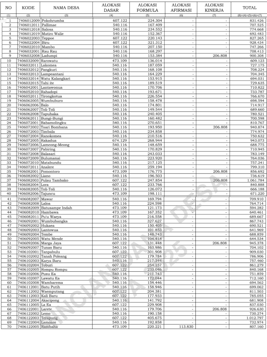 Bombana,A-1.Info | – Kabupaten Bombana mencatat prestasi mengesankan sebagai salah satu penerima alokasi Dana Desa terbesar di Sulawesi Tenggara untuk tahun 2025. Berdasarkan data terkini Badan Pusat Statistik (BPS) yang diperbarui pada 17 Februari 2024, total anggaran yang dialokasikan untuk wilayah ini mencapai Rp94,24 miliar. Dana tersebut akan didistribusikan ke 145 desa dan kelurahan yang tersebar di seluruh Kabupaten Bombana.