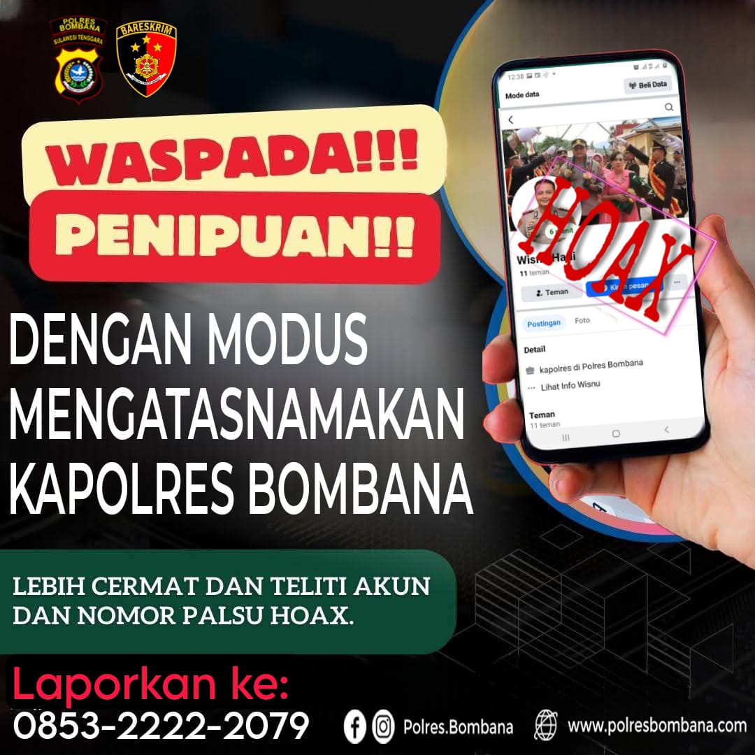 Ia juga menghimbau masyarakat untuk tetap waspada terhadap segala bentuk penipuan yang mengatasnamakan Kapolres Bombana, terutama di media sosial. “Bapak Kapolres tidak memiliki akun Facebook,” tambahnya.